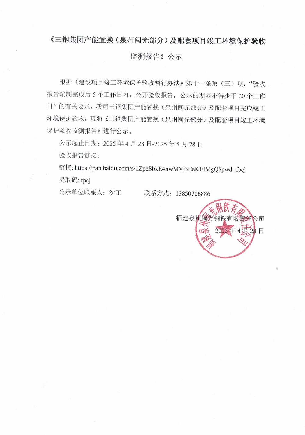 《三鋼集團(tuán)產(chǎn)能置換(泉州閩光部分)及配套項(xiàng)目竣工環(huán)境保護(hù)驗(yàn)收監(jiān)測(cè)報(bào)告》公示