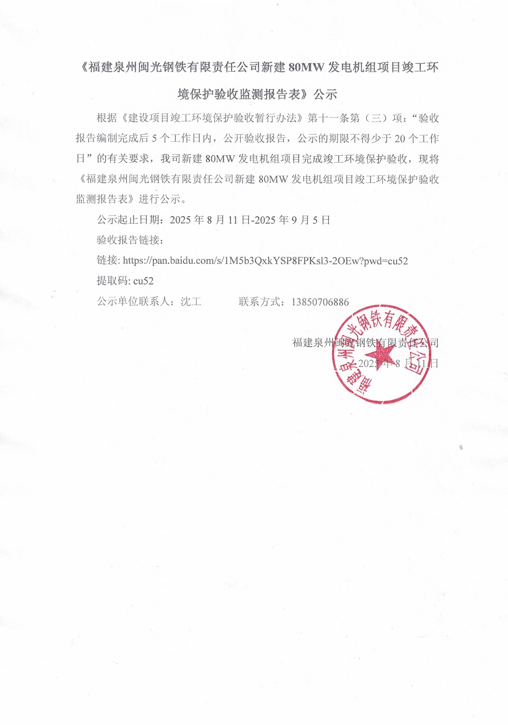 《福建泉州閩光鋼鐵有限責任公司新建80MW發(fā)電機組項目竣工環(huán)境保護驗收監(jiān)測報告表》公示
